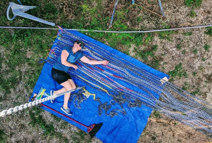 And we checked off a big project on our list …. testing the anchor windlass, confirming that all of the anchor chain is in good condition, and marking every 25 feet of chain with a different color, to make it easy to tell how much chain we lay down in an anchorage. Micki helped me let out all 250 feet of chain, markings every segment with colorful plastic zip ties. Zzzzzzz….ippppp that noise always makes us smile!