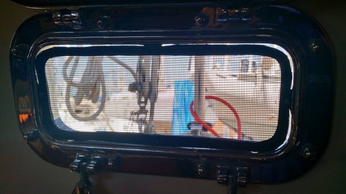 We had a couple of portlights with torn screens – not acceptable for anchoring in the everglades and other areas where there will be lots of mosquitos! Micki took over the task of measuring, cutting, and shaping the screen frame. Then we cut screen fabric donated by a boatyard neighbor to make perfectly sized screens!