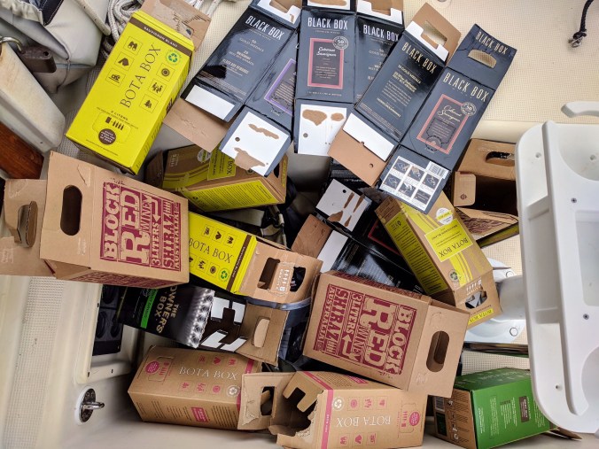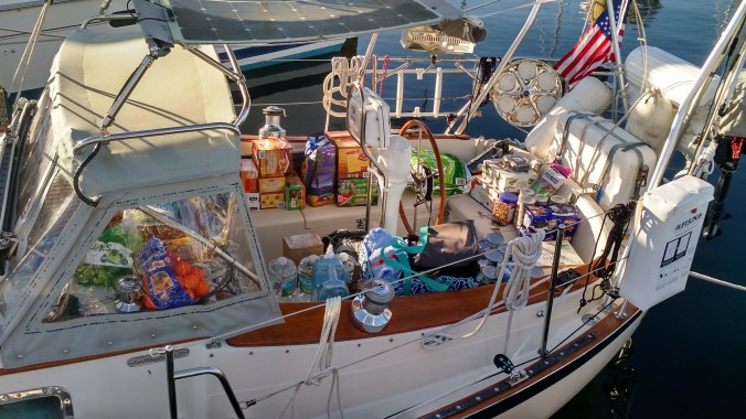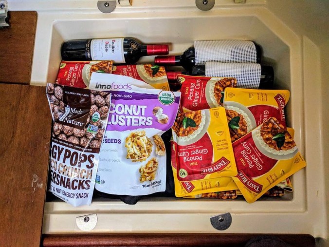 A second, more focused Costco trip got us completely stocked with canned goods, fruit, and gluten free pastas. Since we are storing canned goods in the bilge, we removed the labels, so that if they get wet, and the labels come off, they won’t clog the bilge pump of drainage. We have a hammock to store the fruit, with a bit more are circulation. Although one bad apple really does spoil the barrel. We need to stay on top of it! No scurvy for us on this trip!