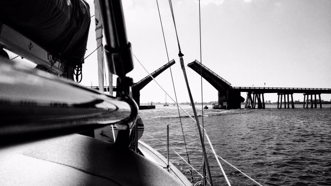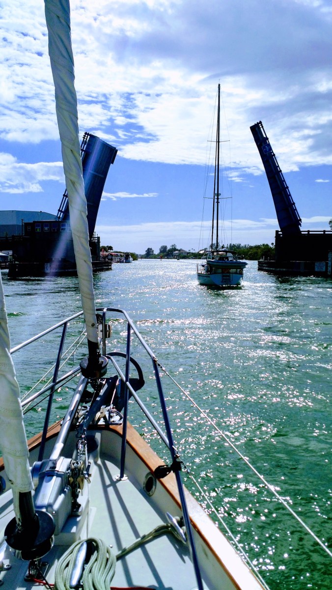 Negotiating the bridges is an interesting process. First, I look up the name of the bridge we are approaching, to ensure I can hail the bridge master by name. Then I speak on VHF channel 9 to get the attention of the next bridge master, let him (or her) know that Sailing Vessel Sanitas is approaching southbound, and to ask for the next scheduled bridge opening time. Invariably, our cruising guidebook is out of date, and lists that the bridge opens every 20 minutes, when it really opens every half hour. Or, it states that the bridge opens on the hour, when we just barely missed the last actual opening at a quarter-till. Once we know the time, we essentially tread water to hold our place until traffic is stopped, the bridge horns sound, the two sides of the bridge fully open, and we can pass safely through the middle. Hopefully, not too many boats are coming from the other direction, or it can get quite crowded! Once we’ve passed through, I let the bridge master know that Sanitas is clear, and thank him for the bridge opening.