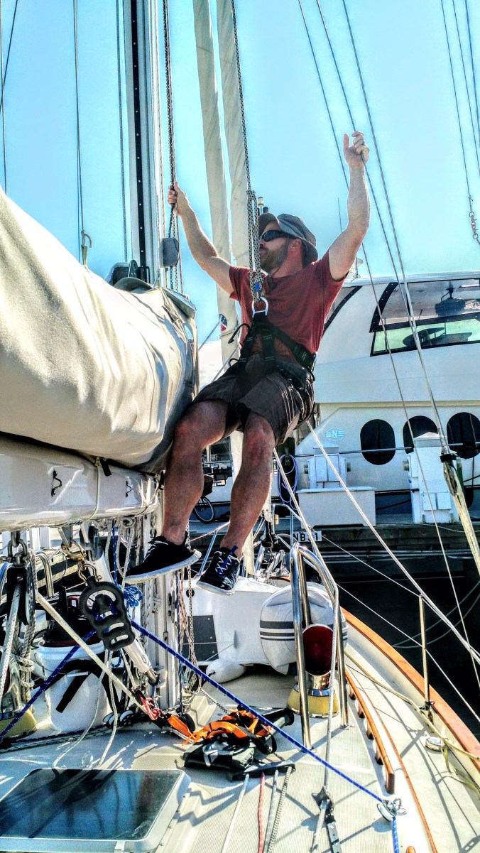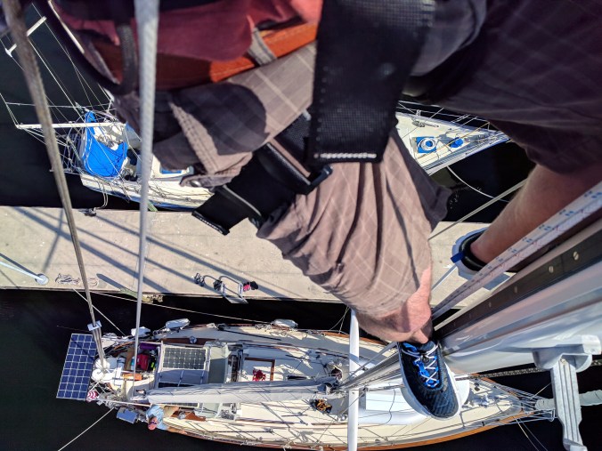 Sometimes you gotta climb…. although Sanitas is only 37ft long, she’s tall! About 49 ft tall (planning for 50 feet, just to be safe) And sometimes, something way up high on that mast will break. When that happens, someone has to climb the mast to fix it. We don’t have anything too seriously wrong with our mast, but just in case, we bought a harness, and a chair to let Mike or me get raised up the mast using a spare halyard and the winches. Today was a shakedown, to make sure we knew how to use all of this cool new gear, to make sure Jenn knew how to lift Mike up and down safely with her wimpy little arms, and to inspect the mast while we’re at it. And why not enjoy the view?