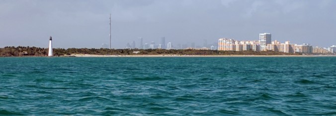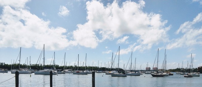As water got shallower and shallower, and the boats got closer and closer together, my thought was “these are not our boats ” “This is not where we belong” and “Turn around Mike!” But sometimes turning around, in a 37 foot sailboat, is easier said than done. Capt Mike was a hero, and somehow found a gap between the too close boats in the too shallow water, and got us out of there. I hailed the marina on 68 and got more detailed directions. Turns out we were supposed to turn INTO Brennan channel and motor back out into Biscayne Bay to find water deep enough for our type of boat. Once you know that, it seems so obvious! Back into deep water, it was still tricky finding the exact ball we had been assigned, but we had plenty of room the maneuver, and I picked up the ball on the first try. Phew!
