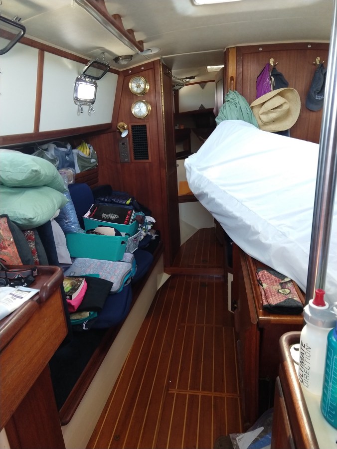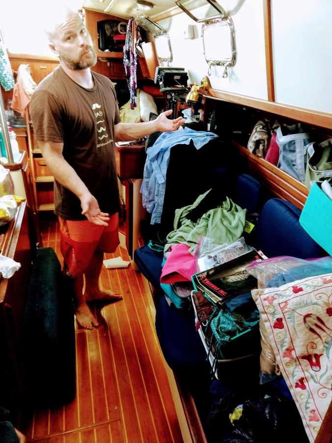 On the day that we sailed from Marathon to Rodriguez Key, winds were 15 to 20 knots, pretty much on our bow, and seas were 3 to 5 feet, with a high periodicity. That’s what sailors call “lively” conditions. Sanitas handled it well, but we definitely bashed into the waves all day long. And we observed that our top speed was reduced by almost 25% in those windward conditions. After successfully anchoring at Rodriguez right about at sunset, thoroughly tired of being tossed around, I entered our forward cabin to find everything had been soaked with sea water. The sheets on the new mattress were wet, my clothes in the cupboard were wet, my toiletries in the closet sat in a puddle, there was water on the floor in the salon, and ever a trickle in the food cupboard. It appears that as water came over the bow again and again all day long, some of that water was getting into the boat and flowing behind the headliner, coming out wherever it could find an escape route. There may have been some tears, wailing, and gnashing of teeth. We pulled everything out of the cabin, made piles of dry, damp, sort of wet, and toxic waste. Ate a can of soup for dinner, and passed out on the couch.