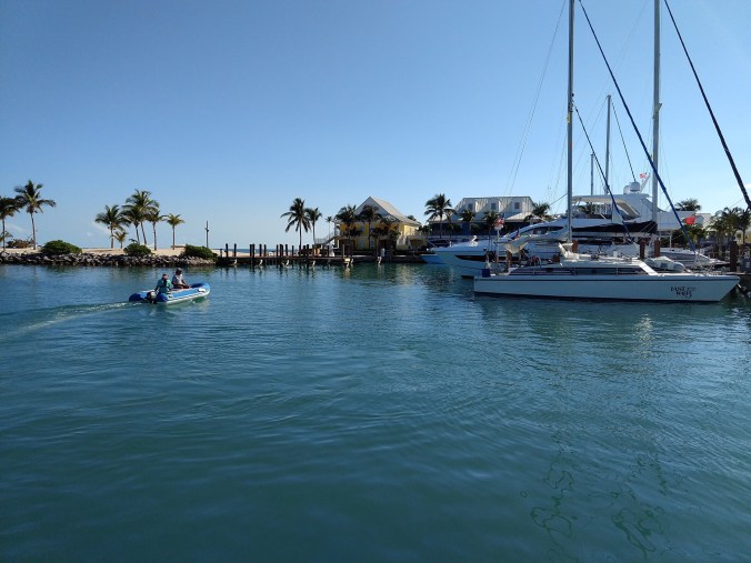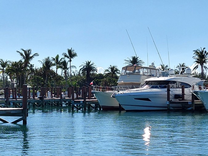 As our three sailboats slowly made our slow and dignified approach into the harbor, planning to tie up at the Customs Dock, a sudden hoard of small and agile go-fast fishing boats zoomed around us and claimed all the spots at the dock. They promptly started blaring dance music, stripping down to bikinis, and popping the top of beer cans. Oh. And jumped ahead of us in the Customs line. It was a bit of a shock to realize that the trip from Miami that had taken us about 15 hours, was also achievable on a small boat with 2 or 4 powerful motors in just a couple of hours. And that the huge Gulf Stream crossing that we had been thinking about for months could be performed as part of a one-day fishing / drinking party. Oh well. It puts things in perspective, and reminds us that sail people and motor people are different breeds! Capt Mike got his revenge in the Customs line when the kids from the fishing boats were talking about the cost of diesel, and when they asked how long Mike was staying in The Bahamas and he answered, “oh, at least three months.” π