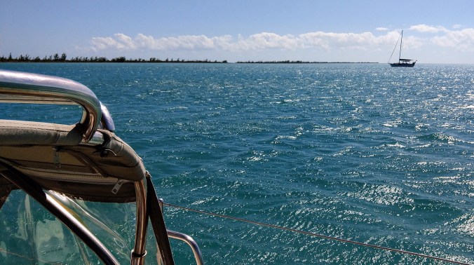 Our trip through the northern Bahamas has been dictated by the winds. It’s tricky for a sail boat of our size and design to sail straight into the wind, and in this part of the world, the prevailing winds are easterlies. So … we motored across the Little Bahama Banks to Mangrove Cay, and then to Great Sale Cay, where the Northwest Harbor is very well protected from the easterly winds. Unfortunately, there’s not much else going on at Great Sale. It is a small, uninhabited island of mostly mangroves, without the gorgeous sandy beaches of tropical fantasies. On our first night there, we had a had a potluck on the beach and watched the sunset (and were feasted upon by sand fleas in the meantime). The dinghy ride back into the wind was enough of a wet and salty ordeal that we didn’t try THAT again!