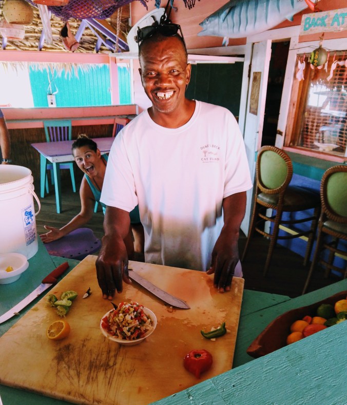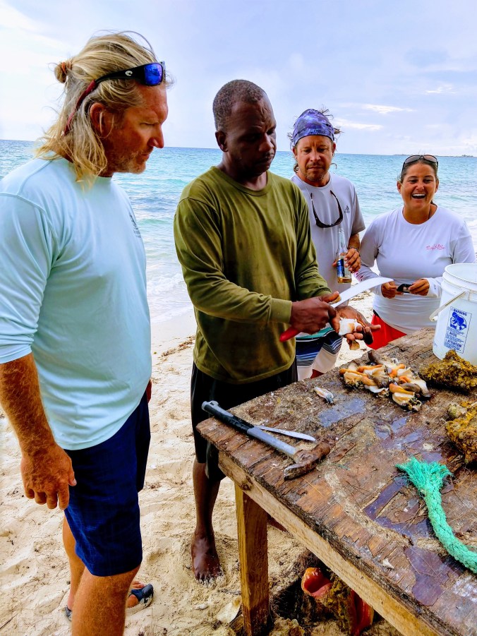 We placed an order for three portions for us and our friends. Duke said, “Let me go get the conch from the freezer”, and walked across the dirt road to the beach. Sensing something awesome, I trailed along behind him. Duke crossed the beach, waded into the choppy ocean waves, took his shirt off, and dove under water. One by one, he pulled conch shells out from the water, and threw them onto the sand. Three… six … nine … twelve. Wow! That’s a lot of conch for three portions! By the time Duke returned to the beach, the crews of Sanitas, Z-Raye, and Orion were all on the beach watching. Duke walked us through the process of cleaning and prepping conch.