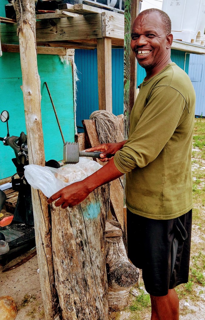 The next day, we returned to Dukes’s after our island tour adventure, for cracked conch. Since Capt. Mike and I need to stick to a gluten-free diet, we ordinarily can’t partake of this breaded and fried delicacy. But …. after hanging with Duke all day yesterday, he told us that if we brought our own gluten-free flour, he would use it to make cracked conch just for us!