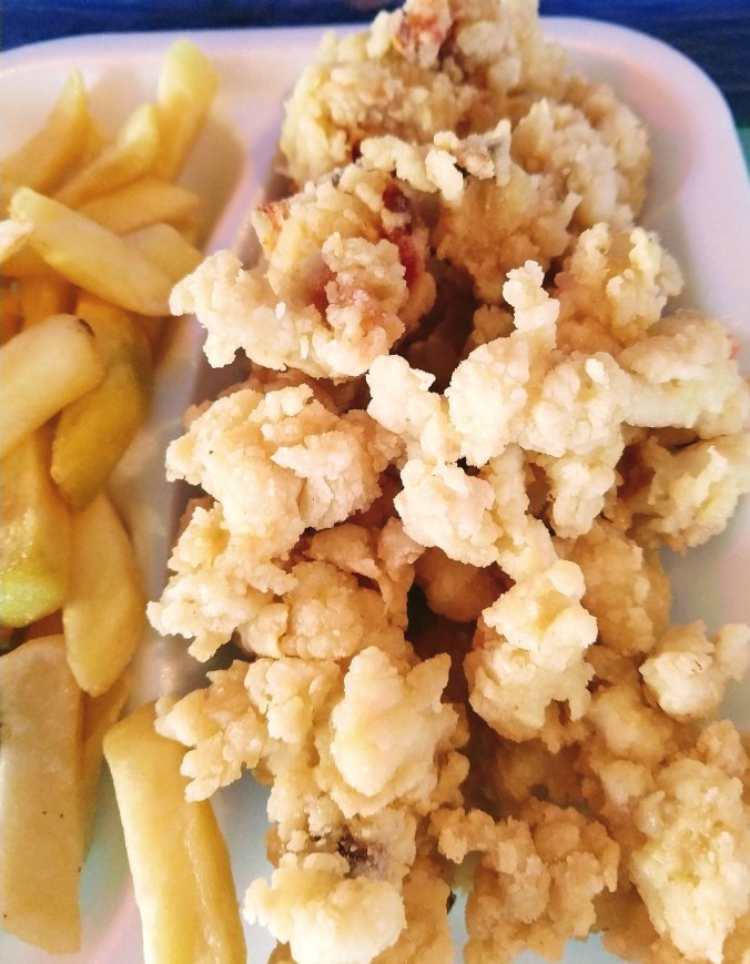 After all of this extremely labor intensive cleaning and prepping (not to mention actually catching the darn things!) comes the civilized part or dipping the strips of tenderized conch in egg, cream, and flour and then frying. Add salt, French fries, and hot sauce (and a rum punch) and you have a meal fit for a queen…. conch (see what I did there?)