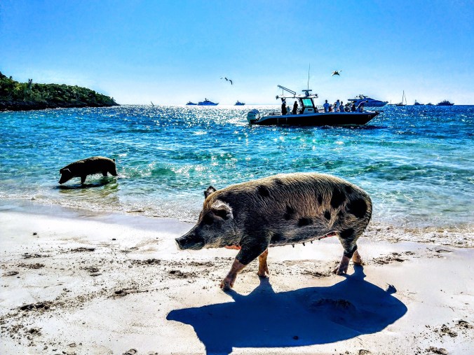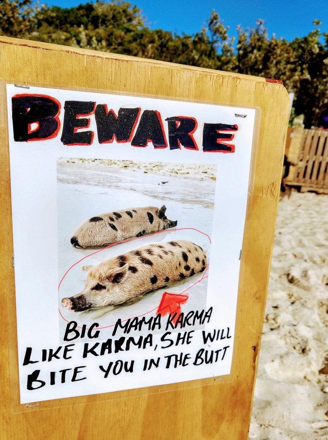 Good thing they warned us to beware of Big Momma Karma! We also received a tip that if the pigs were getting too close, and we felt threatened, just hold our hands out high and completely empty so that the pigs could tell we had no food, and they’d leave us alone. It works! Mike tried this once with a phone in his hand. Apparently Big Momma Karma can’t tell the difference between a cell phone and a candy bar, because she just kept on coming!