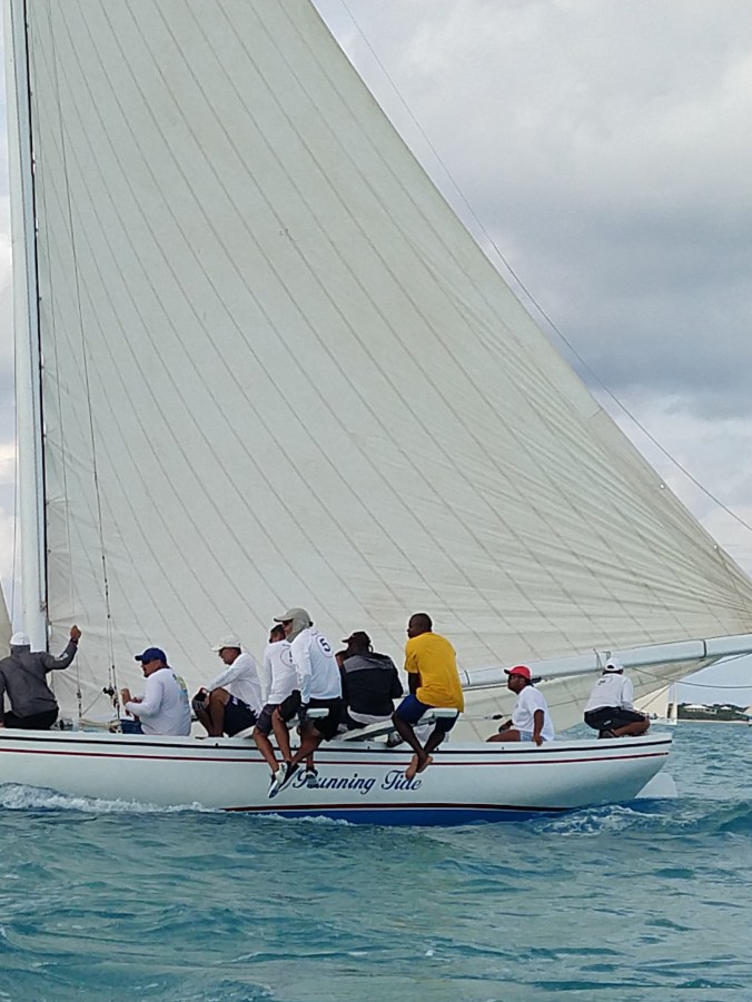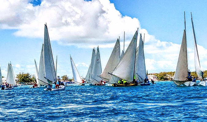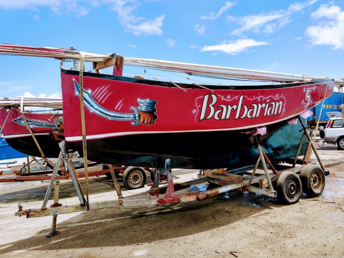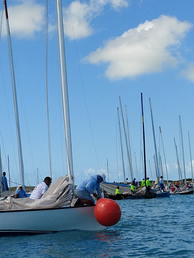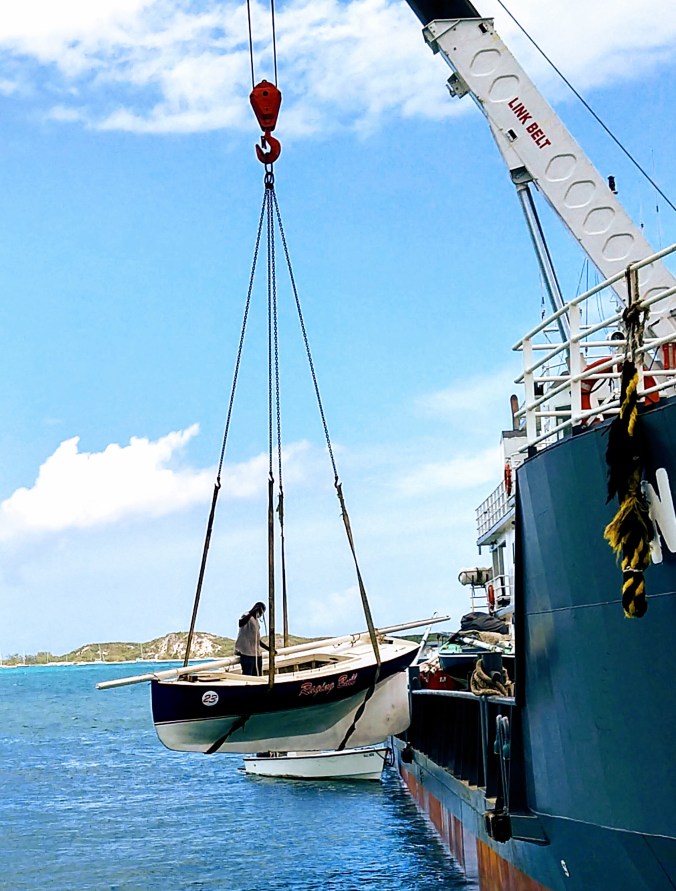 In the days leading up to the start of the regatta, racing boats arrived at Georgetown from all over the country. We went ashore at Government Dock and watched the delicate procedure of unloading the sloops from the mail boats and stepping the masts. I say “delicate” but at times I had to hold my breath because it looked highly likely that the mail boat crane would lower one boat down into the water right on top of the previous boat.