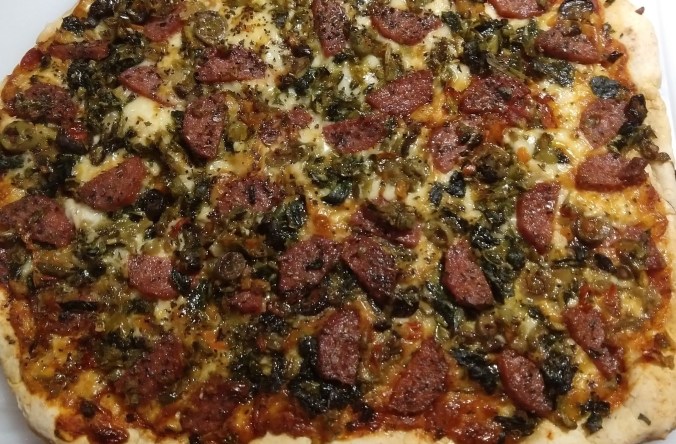 Getting just a teeny bit tired of our variations on the one-pot meal, Mike took on the challenge of creating a gluten-free pizza. This was an all afternoon ordeal of mixing dough, allowing it to rise, rehydrating spinach and green pepper toppings, slicing salami, and making sauce. I think it turned out pretty darn amazing. What do you think?