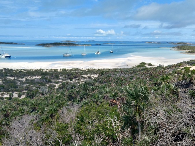 Along with Orion and SE of Disorder, we “dinghy-pooled” over to Cambridge Cay to hike. Poor little Bug could not have covered that distance. Note to self: next year, buy a bigger dinghy and/or outboard! The cliff hike is amazing, with lots of short steep climbs between gorgeous beaches.