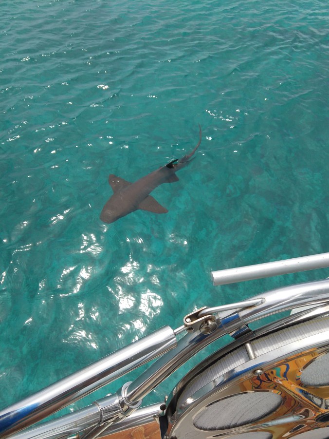 The snorkeling at Warderwick Wells is always amazing. This time, I saw a sea turtle, lion fish, gigantic grouper and lobster. Oh, and Sanitas’ latest friend Sharkey Shark. Am I ever going to get used to the fact that these massive sharks longer than I am tall live under our boat? Better not to think about it!