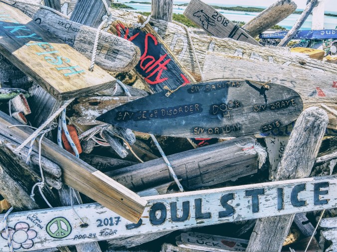 I’ve mentioned the hike to Boo Boo hill, the highest point on Warderwick Wells. This time, we finally got our act together to leave a souvenir of our passage. The St Pete Marina Dock 4 crew is now immortalized on a sign at the top of Boo Boo! (Don’t worry, although we follow the rules of Leave No Trace in the National Park, an exception is made for wooden signs left by cruisers. After a season, or even a few summer storms, they quickly decompose and leave space for next year’s cruisers to leave their own record of their passage.)