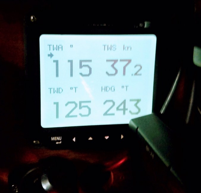 We started off heading southwest at a COG (course over ground) of 260 degrees in less than 10 knots of wind. Capt. Mike created a table to track our course, distance covered, and speed each hour so that we could see our progress. We compared to our GPS data on the chart plotter for a visual indicator of when the Gulf Stream current started pushing us sideways and slowing our southbound progress. Each time that our COG varied significantly from the heading we had set in the auto pilot, we knew that the Gulf Stream was having more effect on Sanitas’ forward progress than our Yanmar engine was, and we needed to point ourselves a few degrees further north. The bonus benefit of the table was that it kept Capt. Mike entertained with data gathering and math on an otherwise long and uneventful day.
