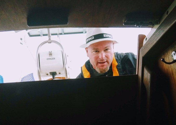 By the fourth mini storm of the day, Capt. Mike had the helm, and he sent me below to stay out of the cold driving rain. I sat at the bottom of the companionway, watching him like a hawk to make sure he wasn’t swept overboard. And shouting up every few minutes, “Are you ok? Do you need anything?”