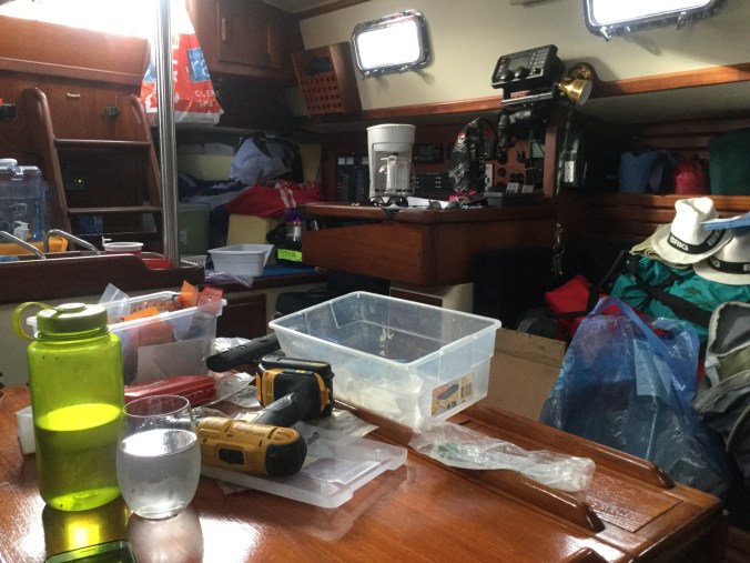 We’ve also done lots of minor projects that don’t sound like much, but will hopefully improve our comfort and happiness in the months to follow. Such as installing lights in the cupboards and head, installing a small shelf in the bilge to keep our stores on canned food above the water, fixing that darn forward water tank hose and installing protection around the fitting, repairing latches on doors, fixing the squeaky companionway stairs, repairing the brass wall clock….You get the idea. In the process, we’ve made many trips to the dumpster, recycling, and Goodwill; made a bit trickier by the fact that our new parking space is about an eight-minute walk away. I hesitate to post pictures yet, because we aren’t yet organized and ready for prime time. Oh, ok. Since you insist. Here’s what living aboard looks like one week later: