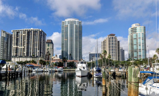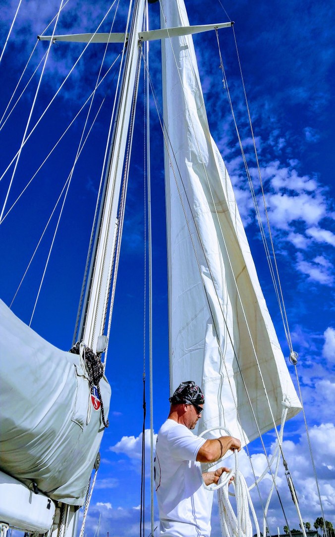 The past week has been a reminder that everything takes longer than anticipated when you’re living on a boat. We were scheduled to put Sanitas in the water at 9am last Thursday…. which turned into the last thing before the yard closed at 5:00. So all the things we planned to do in the water (inspect the mainsail, load new and very heavy house batteries, check all the engine systems) moved to Friday morning. Eventually, we got those tasks done and motored the 3 miles from Salt Creek to the St Pete Municipal Marina Friday afternoon and tied up to the transient wall. Since we are staying for a month and because we have a very low freeboard, we’d requested a slip instead of the wall, but no one in the marina office could find the request until sunset. Then we were told come back tomorrow, and we’ll move you into your slip on the West Dock. So instead of having 3 days of overlap between the marina and our apartment to give us plenty of time to move in, we did it all on Saturday: moved everything we’d been living with for the past two months from the apartment to the boat, then moved everything from the storage unit we rented for the summer onto the boat. That’s a lot of stuff! Did it grow and breed over the summer? Suffice it to say, there wasn’t an inch of room to move on little Sanitas.