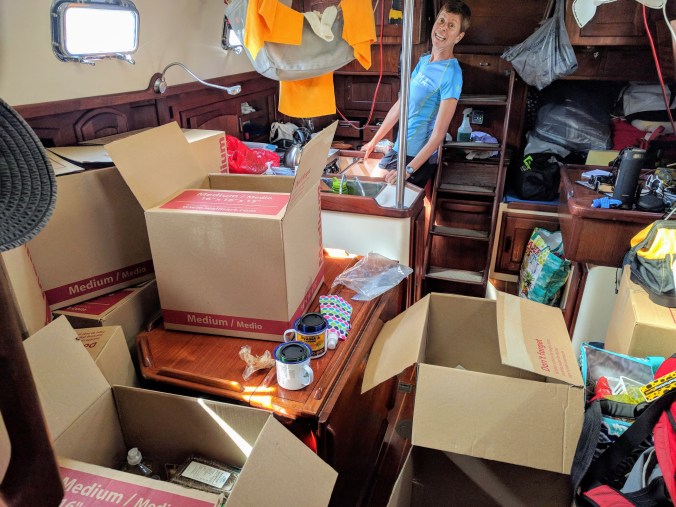 It’s been a week since SV Sanitas splashed into the water of Tampa Bay after her summer vacation in the boat yard, and I guess I can finally say we’ve moved back aboard. We’ve slept in our tiny V-berth, cooked some simple one-pot meals in the galley, and unpacked box after box after box. At first, I couldn’t figure out why it takes so long to unpack such a small boat, but I think I figured it out – there’s no basement you can stash a pile of boxes in and forget about them for months. Or even years!