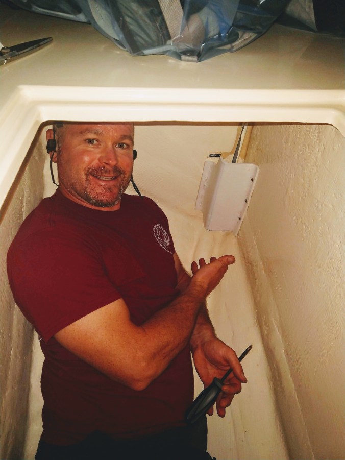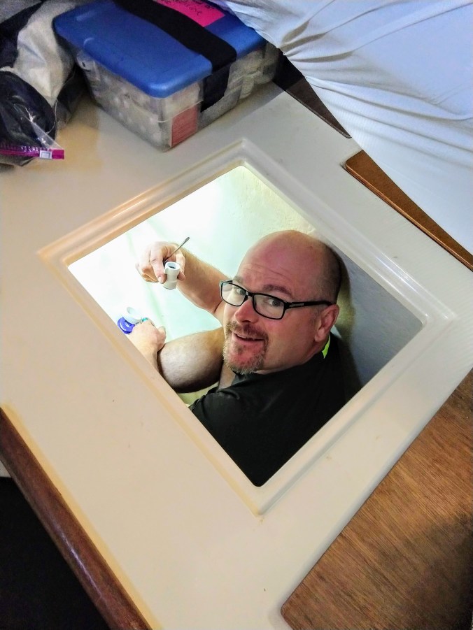 As Capt. Mike was hiding things away in the storage hold under the bed, I heard him shout, “We have a problem! We have a problem! The hold is filling up with water!” Now I interpreted that as we are sinking, and starting trying to remember where the wooden plugs and the waterproof repair tape got stashed. But luckily (?) it just meant that the hose to the forward water tank was leaking and 45 gallons of water were flooding the place where we had just placed our belongings. I turned on all the taps to take some of the pressure off the hose, unloaded everything back into the cockpit where it had started the day, and we dealt with the mess. Eventually, the tank ran dry, we bailed it out, set up fans, spread out our soggy belongings….. and got a cheap hotel room for the night.