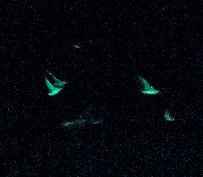 We were escorted by a ghostly flock of seagulls all night long. I speculate that our green running light attracted bugs or small fish, and the gulls kept pace with Sanitas diving and calling and eating until they were stuffed. They didn’t give up and leave us until sunrise.