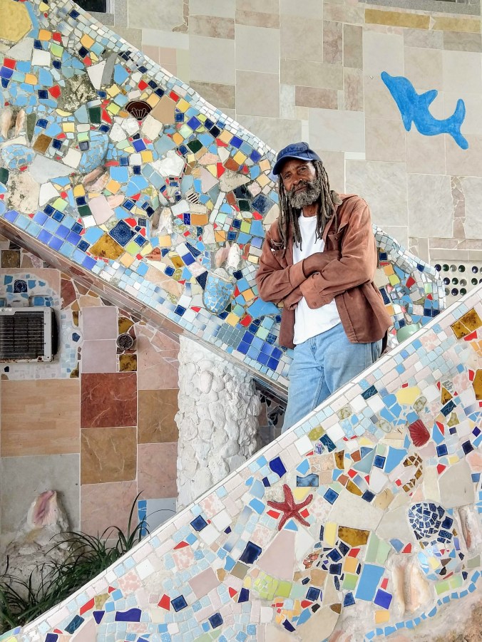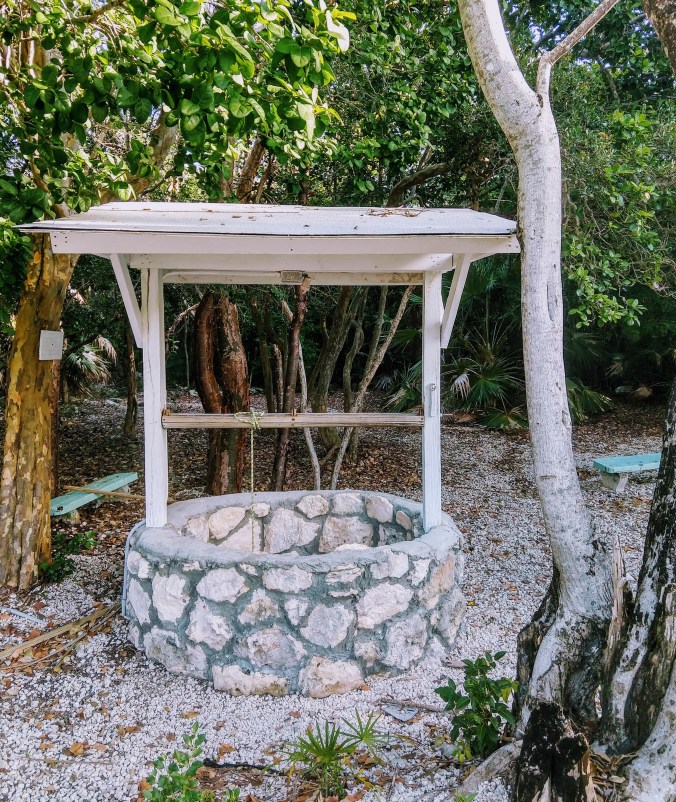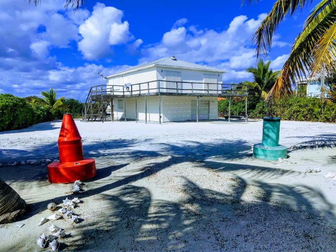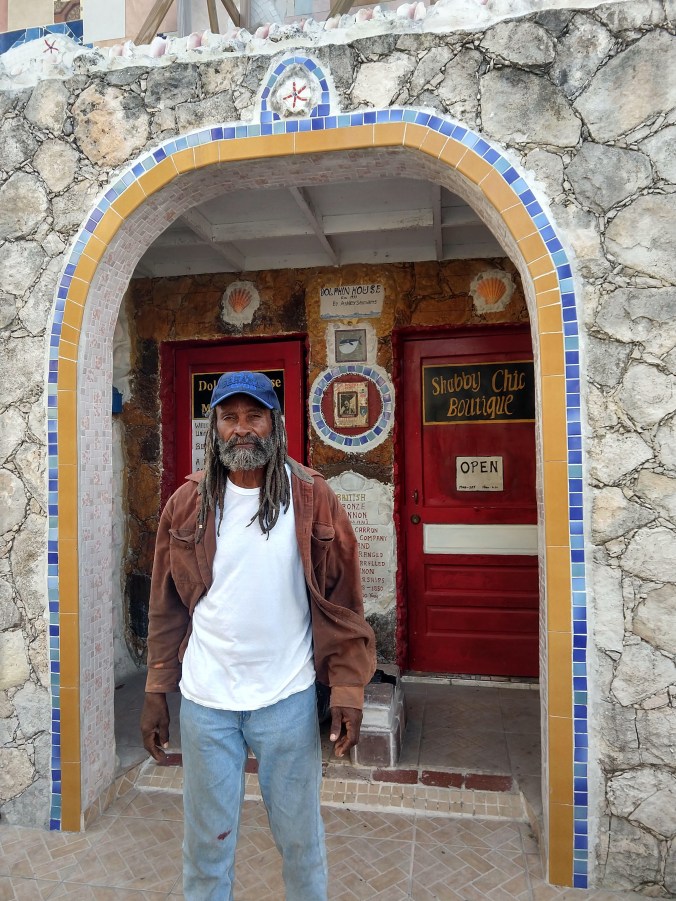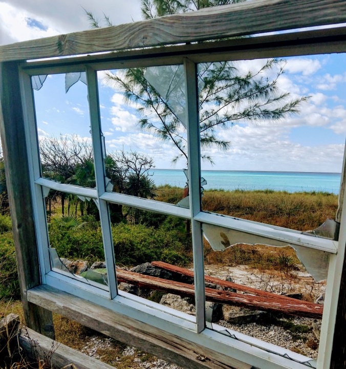 After snorkeling the wreck of a DC3 airplane just outside the anchorage, we all dinghied ashore to explore the small town of Bullocks Harbour. Not much to it but a few brightly colored houses and some pretty flowering gardens and one actual hill to give us a bit of exercise. We sat outside on a grassy bluff overlooking the harbor and had a lunch of pork chops and peas and rice at Coolie Mae’s Sunset Restaurant. (I took this picture with my phone inside my Ugo waterproof purse. Not the best quality picture, but a fun experiment to see if it would actually work)