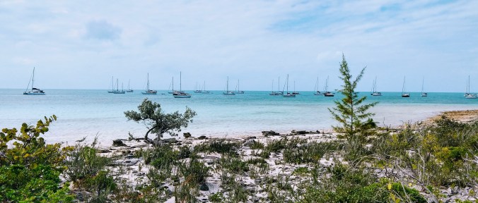 By 2:30, we were anchors-‘down near Little Farmers Cay and I’d say there were at least 100 other boats already in the anchorage. One or two of them were definitely pushing the “no anchor zone” in front of the air strip, lol. You’re the one risking your mast – not me!