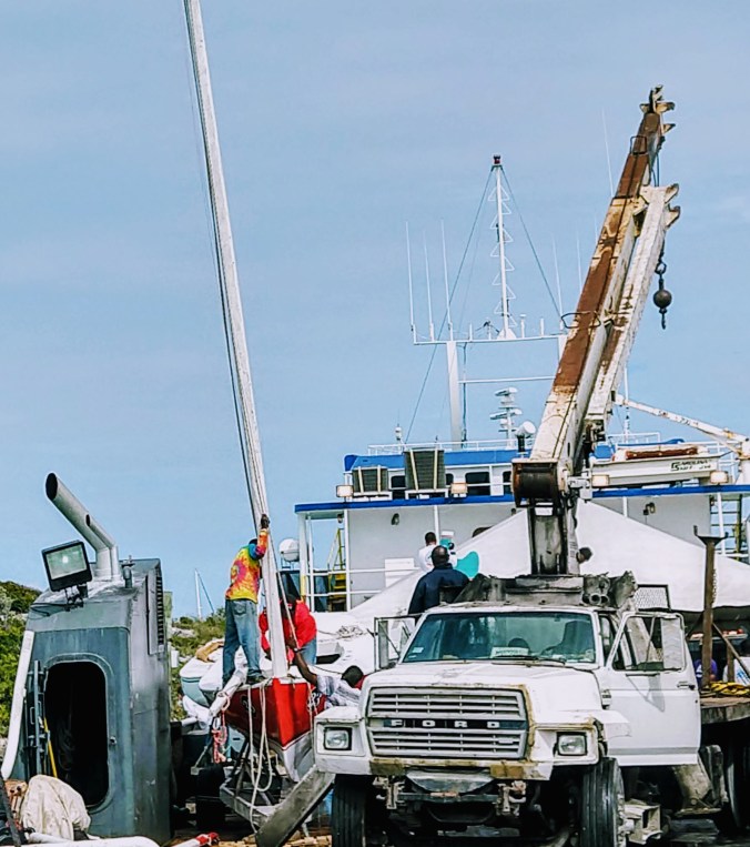 The first race of the Regatta was on Friday, and we were so excited, we couldn’t contain ourselves. We had watched the race boats come in on the mail boat and have their masts restepped. Unfortunately, the boat in this picture, Legal Weapon, got dropped and was damaged too badly to actually race.