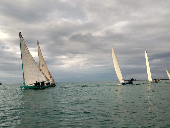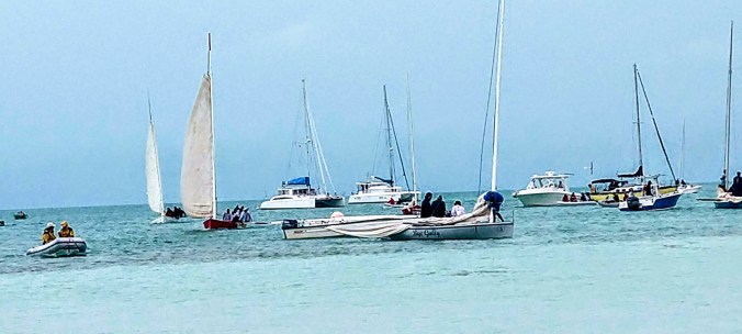 Even though the weather was nasty with wind and rain, we hopped into our trusty Bug and dinghied out to watch the race. And out…. And out …. Only later did we learn that this was the “Ocean Race” – one long sprint from the staring line a couple miles out to the finish just off shore. So by the time little Bug made it out to the starting line, we got a quick view of the start and then and long, wet, miserable ride back through rain and waves that almost swamped us. No fun at all! But watching the start of a race up close is still very exciting. The crews start at anchor. And when the horn blows, the biggest guy starts hauling up the anchor rode, while the next biggest hauls on the halyard to raise the sail. Then there’s a free-for-all of shouting and swearing and jostling for position and to claim the best position to the wind. Be still my beating heart!