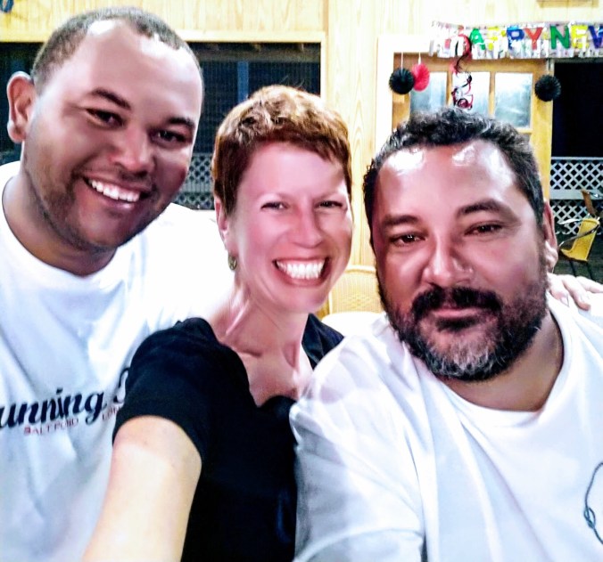 After warming up and drying off and fortifying ourselves with caffeine, we headed ashore followed the sound of dance music to the party on the lawn of the Ocean Club. Capt. Mike got scolded for assuming that the folding table covered with bottles was an honor bar, and attempting to pour his own drink. Oops. But we also had the chance to meet the captain and crew of the Long Island boat, Whitey K, and Mike gushed about how much he admired their sailing prowess. Their captain said “And we’re handsome too!” And posed for a selfie.