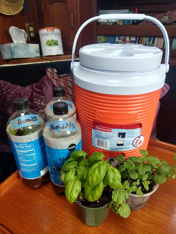 Ten days later, the scoby (symbiotic culture of bacteria and yeast) had fermented away the sugar, leaving a tart and tangy brew. I filled three plastic soda bottles and added mint to one, basil to the second, and left the third plain. Time to get that big old pot out again and make a new batch. Gotta keep the kombucha mother happy by giving her more sugar! After a few days of secondary fermentation in the bottles, I moved them into the refrigerator and started drinking the kombucha as a welcome change from plain water or chemical tasting drink mixes. Success!