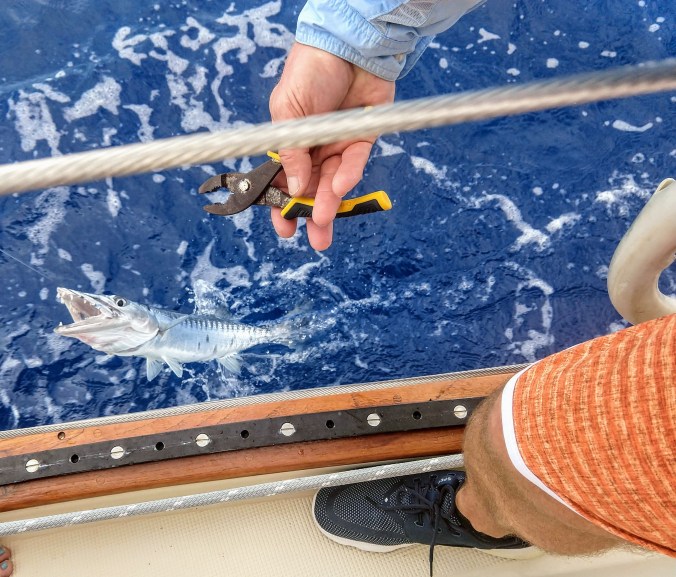 After a couple of days anchored out and living off the grid, we sailed south to the (relatively) busy port of Georgetown on Great Exuma, catching some big shiny barracuda along the way.