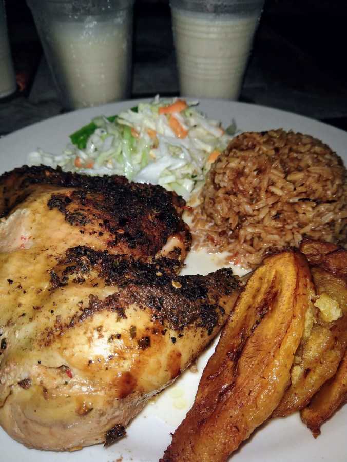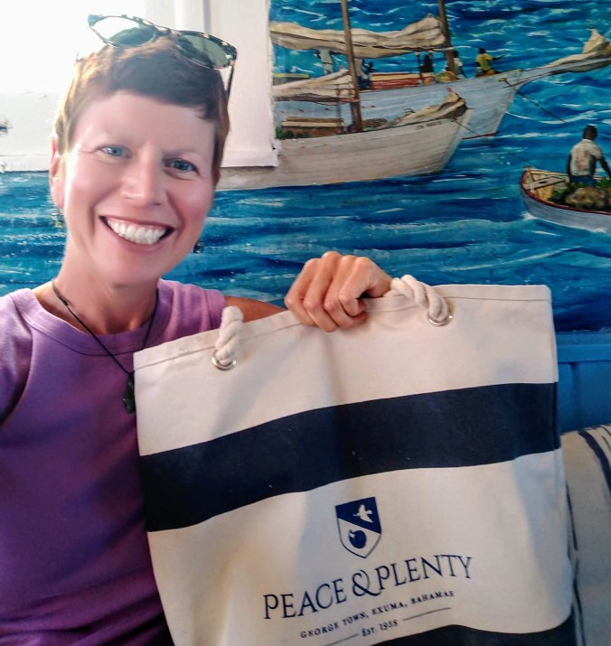 All too soon, it was time to say goodbye to Micki and Nathan and wish them a safe trip back to snowy Denver. Things got a little bit tricky on that last day. They’d spent a lovely night at the Peace and Plenty hotel ashore (and shared their hotel shower with Sanitas’ crew – hot showers are delightful!) but then we’d anchored back out on Elizabeth Harbor for the final night. The wind was up, and the harbor was very choppy that last day, we weren’t sure our little dinghy, Bug, could get four people ashore safely and keep the luggage dry. So we devised a complicated plan. Capt. Mike took Bug across the harbor by himself. The remaining three of us called Elvis’ water taxi and reserved a ride across the harbor at 10:00 so that we could pay for a safe, dry ride. However, nobody ever explained which boat was the water taxi, or how it would find us out at anchor. So…to make a long story short…. they didn’t find us. I hailed the water taxi on the VHF radio on channel 16, channel 14, and channel 68 and called them on the phone. I stood on the bow of the boat waving a bright shirt and yelling at any boat that looked remotely like a water taxi. And as it got closer to the time of their flight, I started waving at any old fishing boat that looked like it might get us across the harbor in time. Eventually I flagged down a water taxi a whole hour later than the original plan. The driver said, “I saw you waving at me, but why didn’t you hail me?” Hello!?! What did you think I was waiving that bright shirt and yelling so frantically for? Just to be friendly? It was quite the fiasco. But all’s well that ends well, and we had just enough time to grab a quick lunch from the jerk chicken shack and walk to the yacht club to catch a taxi to the airport. I hope Micki and Nathan enjoyed their visit! Thanks for the gift of the Peace and Plenty beach bag!