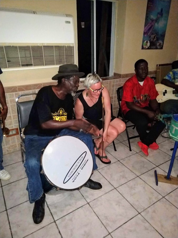 The beach life is fun and all, but we decided to mix things up a bit and hit some nightlife by dragging Micki and Nathan to a traditional Bahamian rake ‘n scrape. This Monday night tradition at Eddie’s Edgewater is a ton of fun. After eating a big plate of chicken plantains, and rice and peas, and after drinking a couple of Sky Juice cocktails (gin, coconut water, and condensed milk) we were ready to dance. The band included everything from guitar to horns to the saw – that’s what makes it a real rake ‘n scrape as opposed to just a boring old band. Micki loves music and is always ready to learn something new, so she got a quick saw lesson, mostly in how to hold it so you don’t cut yourself, and then she joined the band. We pretty much closed the place down, dancing until we couldn’t handle the heat and the Bahamian volume of the music, then catching our breaths hanging out with other cruisers on the patio, then dancing some more. Eddie’s is always a great night!