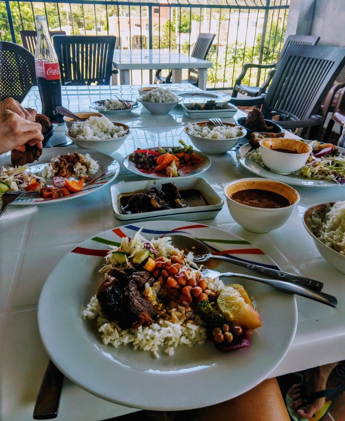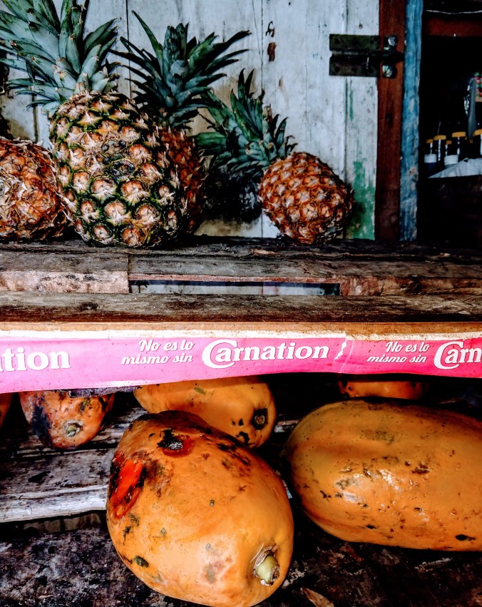 One day last week, we tried to eat lunch at the Chicken Shack, but we were too late and Luisa was sold out. So we walked back to Wendy’s Bar to ask Watchie the bartender for another recommendation. “Stay here, we’ll order lunch for you” he said. Another tricky conversation about being allergic to wheat. Next thing you know, both Watchie and Wendy’s mom are on their cell phones, calling various restaurants, asking whether the Plato del Dia is fried chicken or roasted chicken. I kind of lost track of what was going on at that point, but soon multiple delivery people showed up on foot or on motorbikes with takeout containers. Watchy spoke to them in Spanish, paid them, and brought us plates and silverware. We ended up with a plate of black beans and rice, one of white rice with a cup of habichuelas (ranchero beans) and a side salad of shredded lettuce and tomatoes. After about 15 minutes, another bowl appeared, full of roasted chicken in a savory sauce. Now, I’m speculating here. But I think what happened is that Watchie and Wendy’s mom felt bad that they hadn’t found us any gluten-free Chicken. So Wendy’s mom brought us some from her own kitchen! It was delicious, and we made sure to stuff a couple hundred pesos in the tip jar to cover it. How amazing is that?