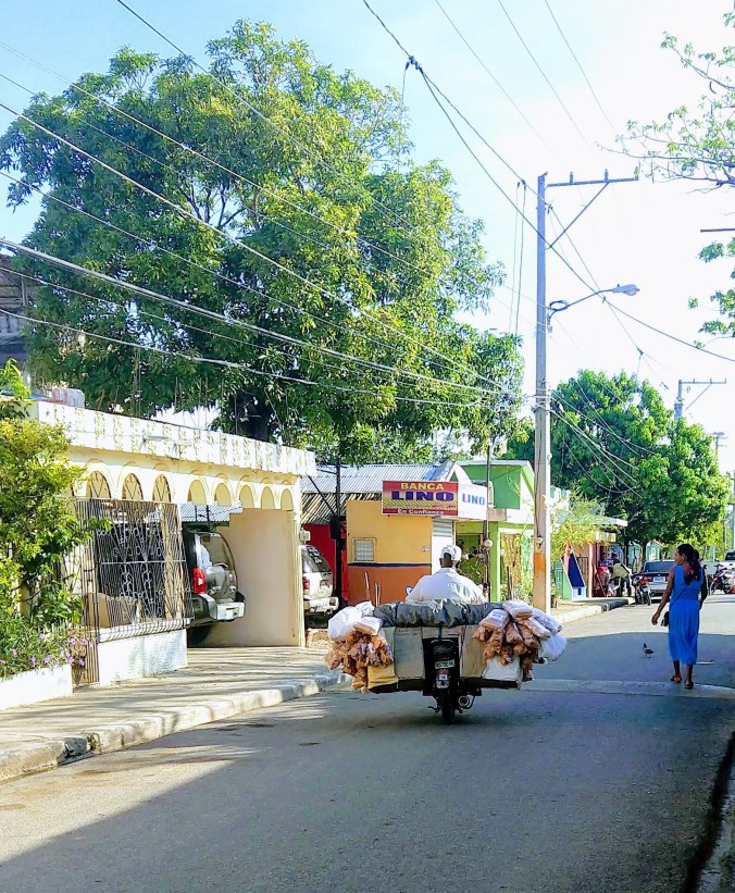 For such a small town, there’s every sort of transportation available. The most popular are small (but extremely loud) motor bikes. Some operate as taxis, and motorconcho corner is the loudest part of town. Of course, there are plenty of cars and trucks. The water delivery truck always seems to be filling up the road wherever I walk. The shared taxis (or guauguas) are a cheap way to get between towns. They’re regular sedan cars that don’t leave the taxi stand until they’re full. And full means the driver plus two passengers in the front, and four passengers in the back. Good thing it’s not a very long ride! There’s a big modern passenger bus that travels between Luperon and Santo Dominingo twice a day. When you see it coming, it seems impossible that that behemoth will actually fit down the narrow street, and will make the turn around the corner without taking down part of a building. At the other extreme, some people still ride horses or donkey, and use them to carry impressively massive loads through the center of town. Which then adds poop to the mud in the middle of the street. I might need to throw away my flip flops after a few weeks in Luperon.
