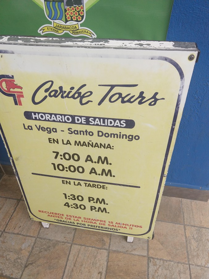 Once we arrived in Imbert, we simply crossed the street to the Javilla Tours bus station and looked for the boleteria, or ticket window. These van-sized busses only go one place – to the next biggest town of Santiago, so buying a ticket was easy. 130 pesos each and we were on our way! It was surprisingly organized. They gave everyone a deli counter number, so there was no rushing for the next bus. Everyone just lined up politely and got on in numeric order. But then we ran into our first problem. Capt. Mike was trying to track our progress with Google off-line maps and he had just said “We’ve got about 15 minutes to go” When I said “Wait! Isn’t that the Caribe Tours bus station? ” Darn Google! We traveled about half a mile in the wrong direction because neither of us knew how to ask the bus driver to stop in Spanish. Finally I decided it was better to embarrass myself than to keep going the wrong way, so I jumped up in the aisle and started waving my arms and saying stop until the bus pulled over. Phew! Now we just had to reverse our track on foot back to the big yellow bus station.