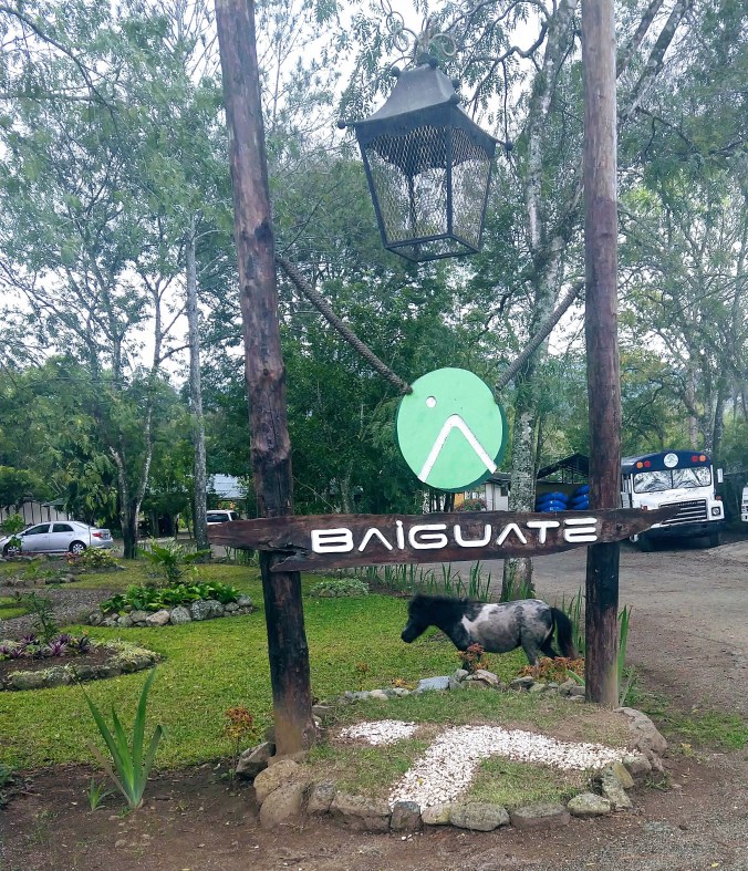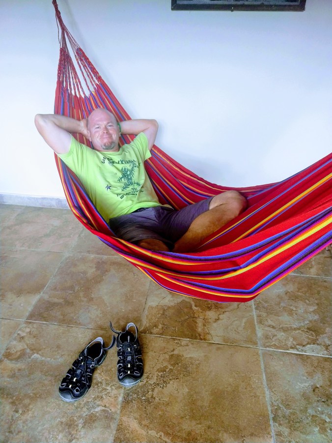 Suddenly, we were transported to paradise! The lodge is set in a lovely wooded glen filled with flowering tropical plants designed to attract butterflies. There’s a river, and a swimming pool, and even miniature horses wandering through the grounds on their own. The restaurant is open air with a tin roof that goes “BANG!” every time a mango drops from a nearby tree. Those street shack eggs and potatoes seemed like a long time ago, so we browsed the lunch buffet and found salad! and vegetables! and roasted eggplant! and chicken. Oh yum. This is the first night we’ve spent away from Sanitas since the beginning of November and I reveled in the queen size beds. Capt. Mike was equally excited about the hammock on the patio.
