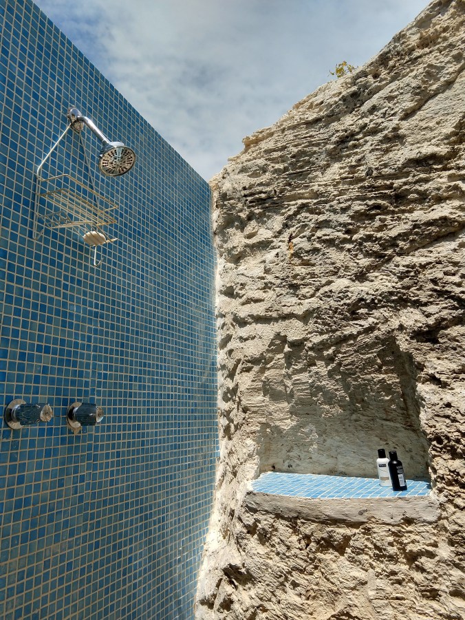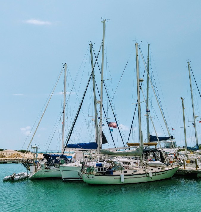 The Southside Marina was lovely and “islandly” Only $50 a night (reasonable in pricy Providenciales) and we had to tie up with a Mediterranean mooring. The showers were open air and built right into the cliff.