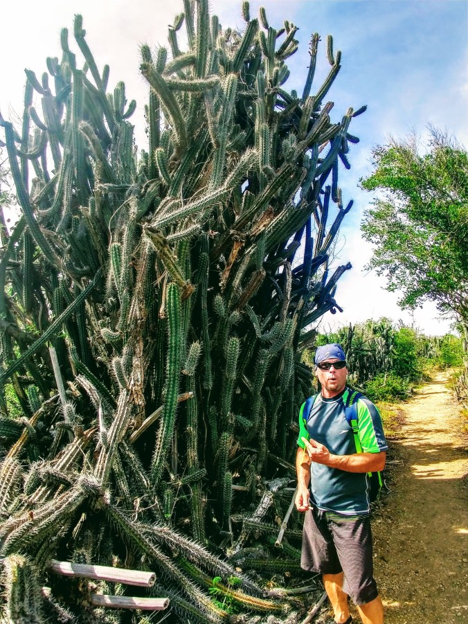 From Ponce, we made a short hop to Isla Cana de Muertos, or Coffin Island. I was looking forward to a beach day, but the weather didn’t cooperate. Instead, the island made us work to discover its treasures. It was difficult to find a safe place to dinghy ashore, and when we did, the trail was overgrown with cactus plants of every shape and size. They were beautiful, and fascinating, but still prickly! I wished many times for a machete for a little DIY trail maintenance. Capt. Mike wished the same after a baby cactus hitched a ride on his leg.