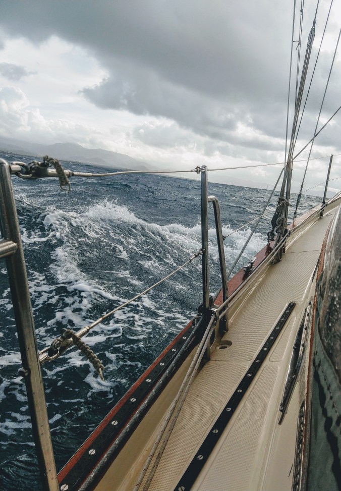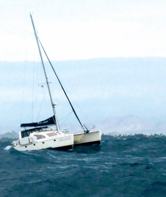 After a few days exploring on land, we headed east again. Set the alarm for 4:00am and headed out before sunrise to try to catch a period of calm before the daily trades kicked up. It didn’t work. We actually experienced some of the worst weather and roughest seas we’d seen all season. I tell people that I don’t get seasick, but that day, I might have been lying. On the plus side, I got some great pictures of our buddy boat Soluna riding on one hull in the big waves.