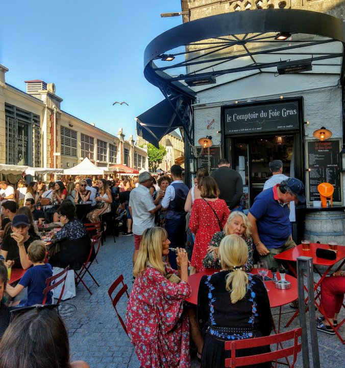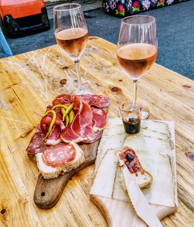 That evening, we stumbled into the Wednesday market. (I guess my French isn’t really that good – I translated the signs to mean they were closing the street for a parade. Oops!) So much fun to see the narrow brick streets jammed with people of all ages, and everyone happy, smiling, shopping, and drinking wine. We grabbed wooden platters of sausage and cheese and a couple of glasses of crisp rosé at Least Comptoir du Fois Gras and soaked it all in.