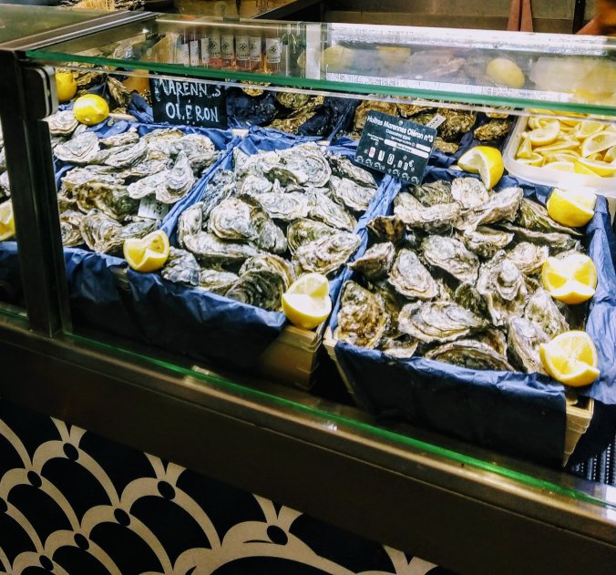 Lest you think we only eat cheese and sausage, never fear! I discovered another food group as a sign posted outside Les Halles market drew me in. A dozen oysters and two very small plastic cups of wine for 10 Euros! That’s the face of a happy Jenn.