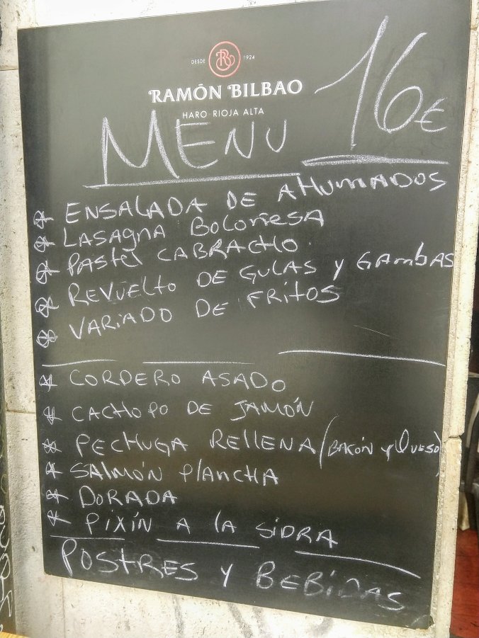 (So the photo below is a regular people’s weekend menu, not a pilgrim menu, so it’s more expensive, but you can see how it works- and how difficult it can be to decide what to order if you don’t speak Spanish!)