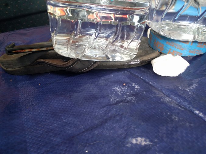 Just for fun, here’s a picture of Mike’s flip flop – glued together with silicon caulk and with a big hug of water holding it in place to dry!