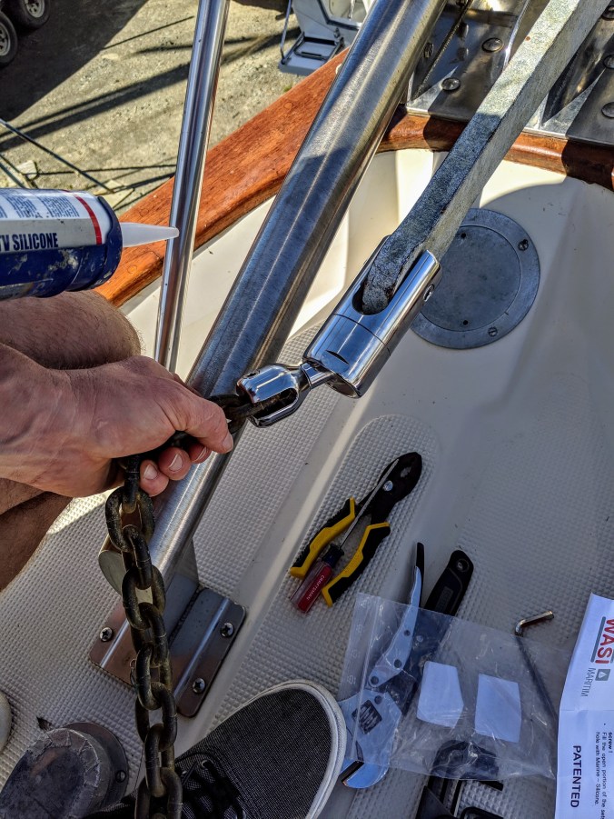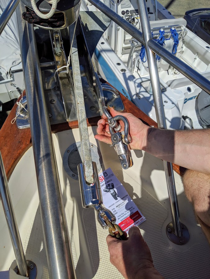Capt. Mike does the important jobs that will actually keep us safe at sea. For example, replacing the swivel hardware that connects our big, heavy Bugel anchor to the rode chain. While the anchor has performed fabulously over the past two seasons, the connector has been known to fail, which could allow Sanitas to drift into another boat or onto shore, or at the very least could allow us to lose that expensive anchor! Our German friend, Andreas, recommended a Wasi anchor swivel, so Mike replaced it is an abundance of caution. Hopefully this will let us sleep soundly at night once we’re living on the hook again!