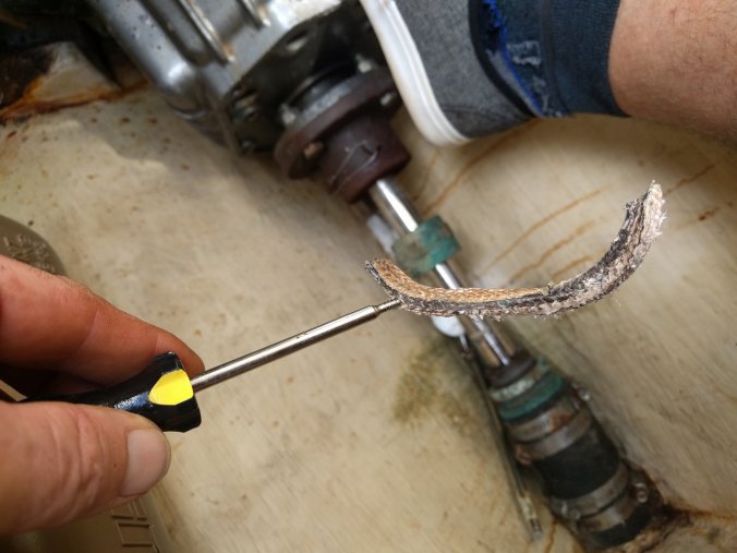 For his next trick, Capt. Mike replaced the stuffing material around the rudder post. My very nontechnical understanding of this is: there are two things that have to go from the inside of the boat (where the motor and steering mechanism are) to the outside of the boat (where they actually propel us or steer us through the water). These two items are the prop shaft which moves the propeller and the rudder shaft which moves (can you guess?) the rudder. The boundary between the inside and the outside is called the stuffing box. A thin strand of Teflon material, that looks kind of like an extra fat shoelace, wraps around the rudder post inside the stuffing box and forms a fairly tight seal. If installed properly, it keep MOST of the water out, just allowing a slow drip into the bilge.