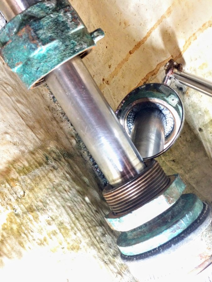 It’s definitely the most difficult space in the boat to work in. Capt. Mike has to do some serious boat yoga to fit into the space. And it’s almost unbearably hot. He had to use the big wrenches for this project!