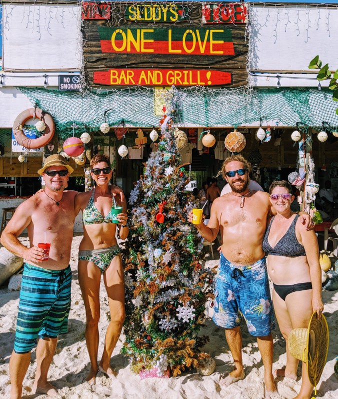 On the day after Christmas, we made the short hop from St John to Jost van Dyke in the British Virgin Islands. Along with our friends Zach and Lindy on Holiday, we planned to find the perfect spot to wait for New Year’s Eve. The annual party at Foxy’s bar and restaurant is legendary. This year’s theme was “Aladdin” with costumes encouraged, and we’d learned that Foxy had already sold over 100 VIP tickets at $600 each. Yikes! Way above our cruisers’ budget, but we could hang out with the little people for free (or at least for the cost of a couple of rum punches).