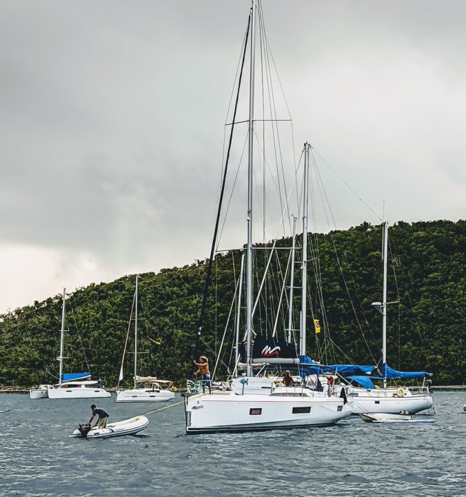 We picked up a mooring ball for $30 per night – sort of like paying for a spot in a campground on land – and settled into the neighborhood. Great Harbor is the biggest “town” on Jost van Dyke, but that’s not saying much! One sand-covered road follows the curve of the bay, there’s the ferry dock and customs, and a few restaurants and bars. It’s the only place on the island where you can clear into the BVIs, so there’s plenty of boat traffic and comings and goings.